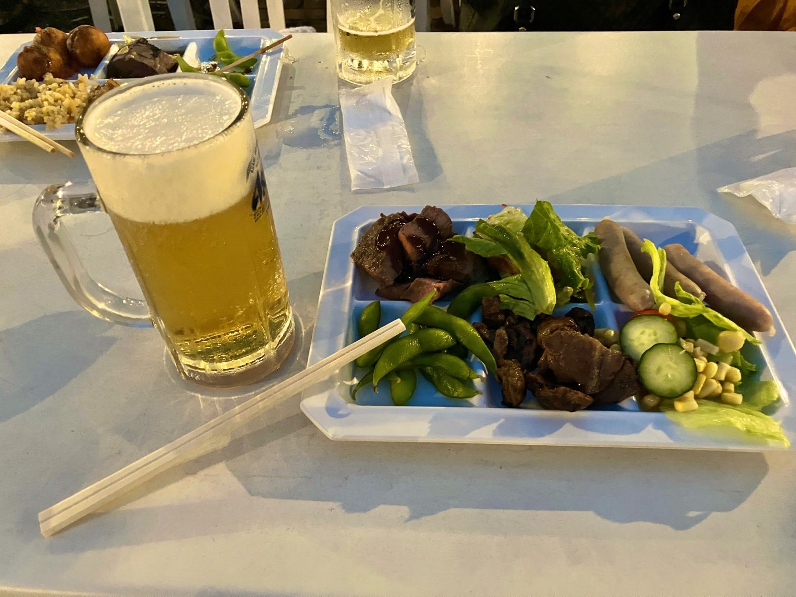 地元のお祭りにて屋台で焼きそばや串焼、スイーツをほおばりながら、