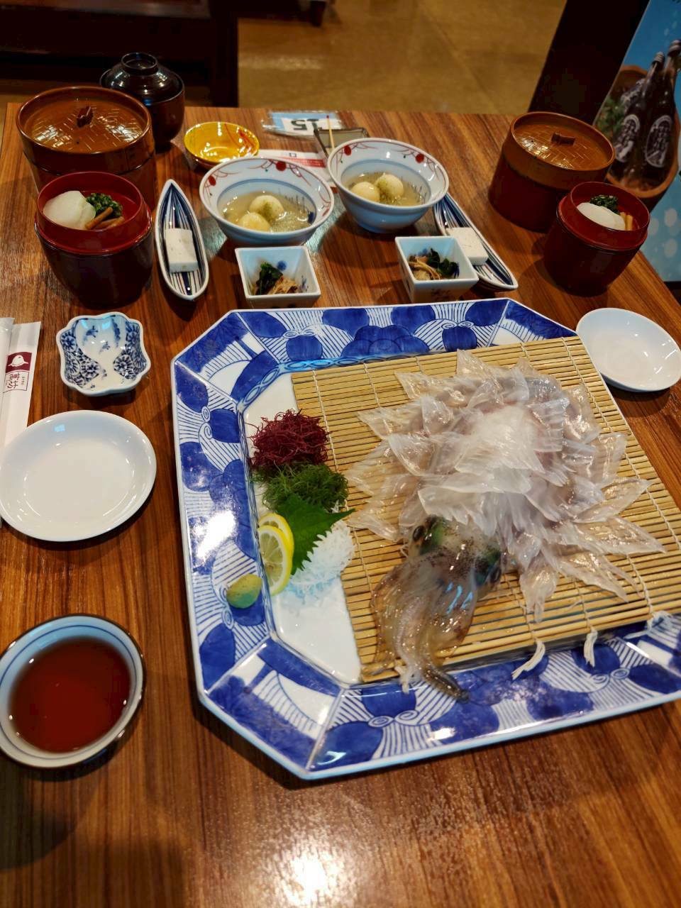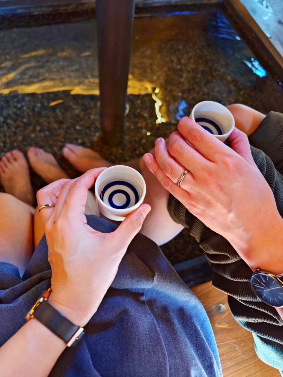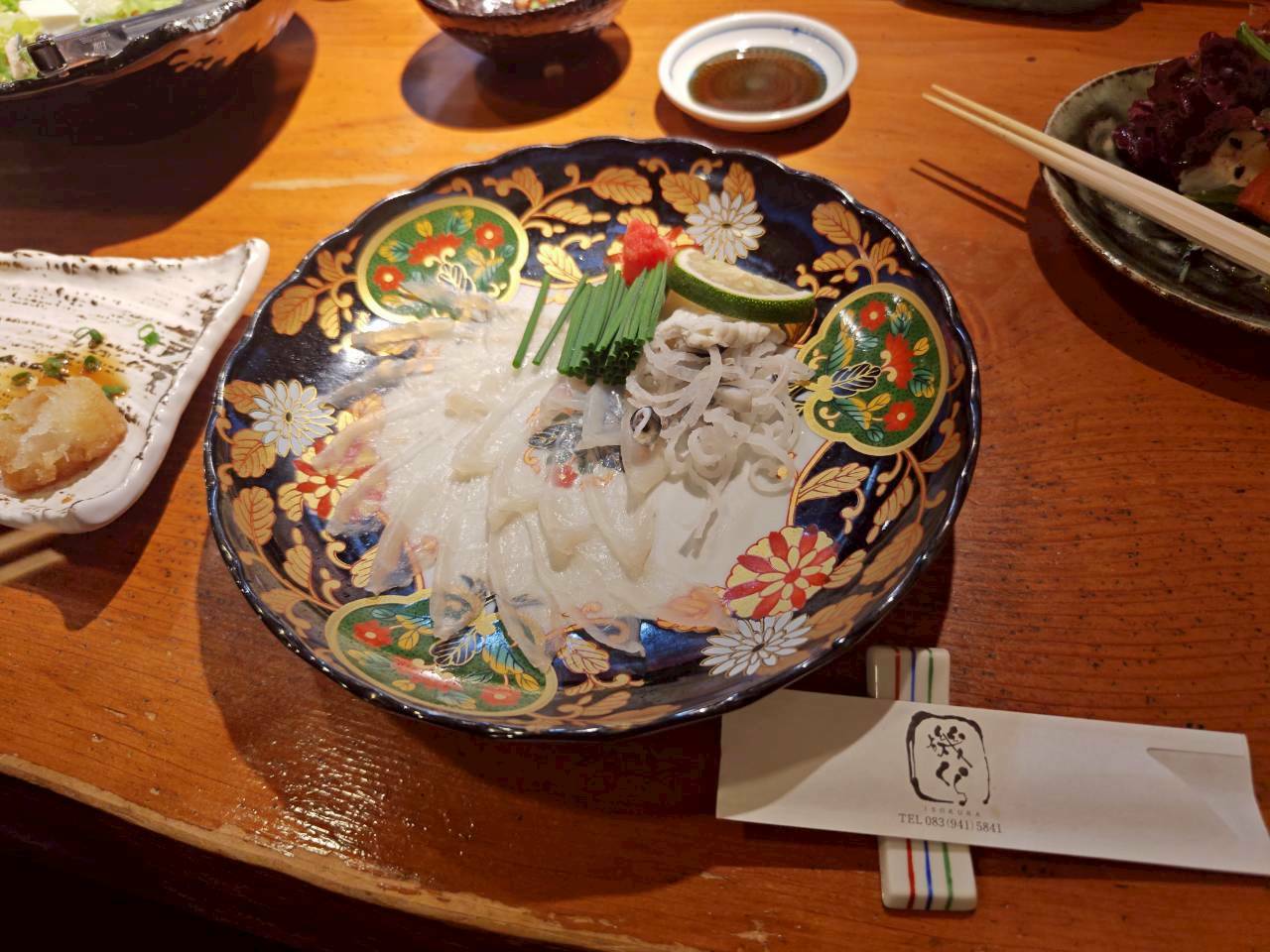 その後は足湯をしながら日本酒を飲んだり、夜には初めてのふぐ刺しを食べたりしました。